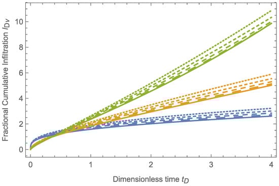 Short-time-approximated solution for fractional cumulative infiltration considering different soil types represented by , with and subdiffusive, classical, and superdiffusive flows represented by , respectively. Results in green correspond to , results in orange to , and results in blue to , where a more dashed line indicates a lower value of .