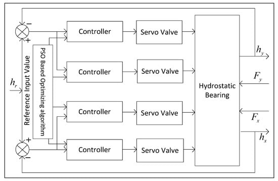 The details of the working principle for active hydrostatic bearing can be found in existing literature [31]. The hydrostatic journal bearing with a servo control mechanism is shown in Figure 1. The flow chart on which Figure 1 is based is shown in Figure 2, where two servo valves are responsible for the horizontal bearing clearance and two valves are responsible for the vertical bearing clearance. The external load is also divided into horizontal and vertical components. The controllers are tuned with the help of a particle swarm optimization algorithm. The displacement sensors measure the bearing clearance with the help of shaft displacement. The error signal is generated by the comparison of the reference signal and the signal of displacement sensor. The controllers use error signal to drive spool of the servo valve, so that the desired fluid flow can be delivered to hydrostatic bearing to achieve the required bearing clearance.