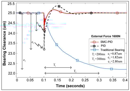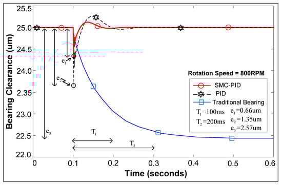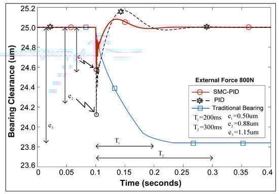 There are certain factors which stop hydrostatic bearing from attaining a new equilibrium position after application of the external load. These factors are throttling effect, the mass of the components of the bearing, inertial effects, and hydrostatic stiffness. Mostly efficiency of hydrostatic bearing is measured in term eccentricity and response time to achieve a new equilibrium position when external load is applied. The efficiency of hydrostatic bearing with PID surface-based sliding mode control (SMC-PID) is checked in MATLAB/Simulink by using external load of 800 N and 1600 N, as shown in Figure 3 and Figure 4. The simulation results show that when external load is applied, then active hydrostatic bearing rapidly obtains new equilibrium with zero eccentricity while traditional hydrostatic bearing has a small amount of eccentricity when adjusted to new equilibrium position. The maximum amount of eccentricity for SMC-PID, PID and traditional bearing is and under 800 N load. The amount of eccentricity for SMC-PID, PID and traditional bearing is and under 1600 N load. The results under different external load show that active hydrostatic bearing under SMC-PID has less eccentricity as compared to traditional hydrostatic bearing and active hydrostatic journal bearing under PID. The efficiency is measured in terms of “response time for dynamic equilibrium” and “eccentricity”. The response time is the time which is required to reduce vibrations produced in fluid film due to external loads. The response time to settle vibrations and achieve dynamic equilibrium is s and s for SMC-PID and PID. It shows that active hydrostatic journal bearing under SMC-PID has a faster response to achieve the dynamic equilibrium position.
