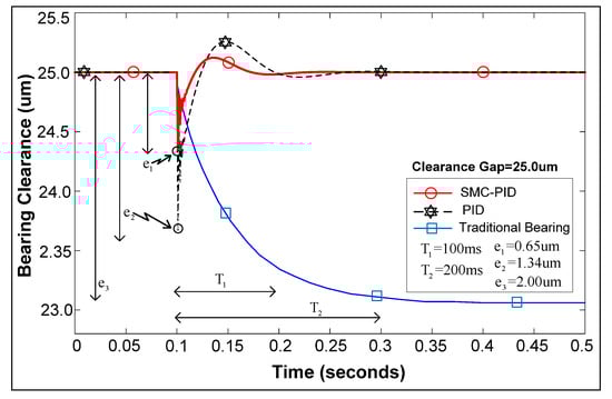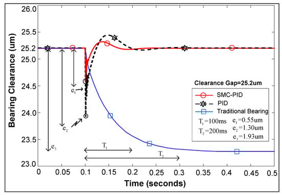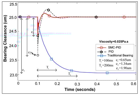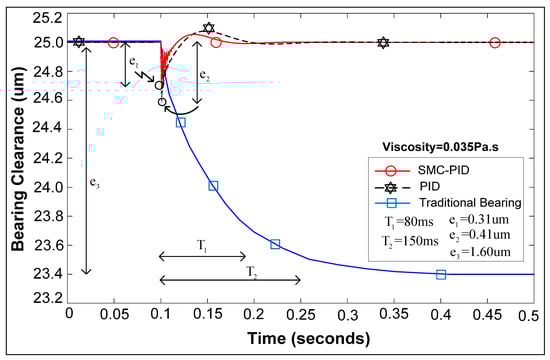 The maximum amount of eccentricity for SMC-PID, PID and traditional bearing is and under while this amount changes to and under . This clearly shows that when the viscosity increases due to the temperature, then there is a decrease in the eccentricity of the hydrostatic bearing. It shows that the performance of the hydrostatic bearing is improved with the smaller increment in viscosity value due to the temperature. The results also show that under same value of viscosity, the performance of hydrostatic bearing is better under SMC-PID as compared to PID and traditional bearing. The response time that is s and s for SMC-PID under and . The response time shows that active hydrostatic bearing under SMC-PID technique quickly suppress the vibrations and achieves dynamic equilibrium with a shorter response time.