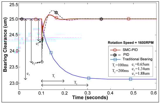Whenever hydrostatic bearing runs at high speed in the presence of eccentricity, then squeezing effects come into play, and it increase oscillation amplitude of vibrations which are produced due to eccentricity. In conventional or traditional hydrostatic bearing, a fixed throttling device is used. So, that is why the hydrodynamic effect is prominent while in active hydrostatic bearing active throttling device (servo valve), the hydrodynamic effect is dominant. To check the efficiency of hydrostatic bearing under the different speeds, simulation experiments were performed and the results are shown in Figure 9 and Figure 10. The results show that the maximum amount of the eccentricity for SMC-PID, PID and traditional bearing is and under while this amount changes to and under . This clearly shows that when the spindle speed increases, then there is a decrease in the eccentricity of hydrostatic bearing due to the hydrodynamic effect and the squeezing effect. The results show that the amount of eccentricity is smaller for SMC-PID as compared to PID and traditional bearing. The response time is not affected much more by the speed of the spindle. However, a slight increase in the vibration amplitude is observed which is due to resonance phenomenon, and it gets prominent at higher speeds. The response shows that the active hydrostatic bearing under SMC-PID technique quickly suppresses the vibrations and achieves the dynamic equilibrium with a shorter response time.