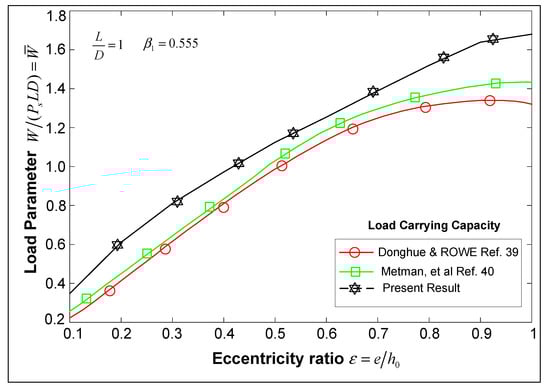 Whenever it comes to the efficiency of the hydrostatic bearing, then the load-carrying capacity plays an important role. In order to check the load-carrying capacity of the proposed active hydrostatic bearing under SMC-PID controller, a number of different loads are applied, and the eccentricity ratio (Ɛ) is measured. A graph is plotted between the load parameter and the eccentricity ratio (Ɛ), as shown in Figure 11. The results of active hydrostatic journal bearing are compared with the results of capillary-controlled hydrostatic bearing from published literature [39,40]. The comparison of results shows that the active hydrostatic bearing has higher load-carrying capacity than the capillary-controlled hydrostatic bearing.