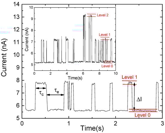 In our study, we deal with devices whose structure is based on the Ni/HfO2/Si stack. The fabrication details, as well as their electric characterization, are given in []. RTN measurements were recorded in the time domain by means of an HP-4155B semiconductor parameter analyzer (Figure 1). The current fluctuation between levels (see the marked levels in red in Figure 1), ΔI, and the spent time in each of the levels are key parameters to analyze. The associated time with the current low level is known as emission time (τe), which is linked to the time the active defect keeps a “captured” electron trapped until it releases it (through this time, it is said that the defect is occupied). On the other hand, the capture time (τc) represents the time taken to capture an electron by an empty defect.