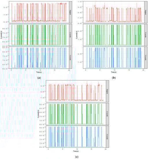 Different RTN signals have been employed here, such as the ones shown in Figure 1. We have determined the number of current levels in order to be able to calculate the emission and capture times for a certain time interval. The current thresholds (red lines in Figure 1) were chosen to allow the extraction algorithm to calculate the time intervals corresponding to the levels defined previously.