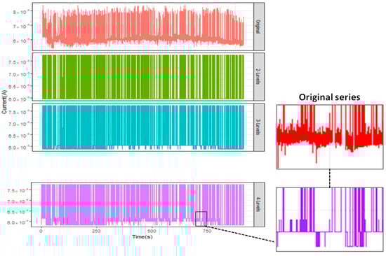 A similar exploratory analysis for this trace was carried out. This signal was supplied with 0.5 V, and its behavior was measured for more than three hours. To study the number of possible latent levels hidden in the signal, we again considered hidden Markov chains. The best fit was achieved for latent levels 3 and 4 for this long RTN trace. Figure 3 shows the original observed signal (a time interval of the whole signal was considered for the sake of computing feasibility) and the corresponding latent levels given by the model for both cases. This analysis also was performed using the depmixS4 package of R-cran.