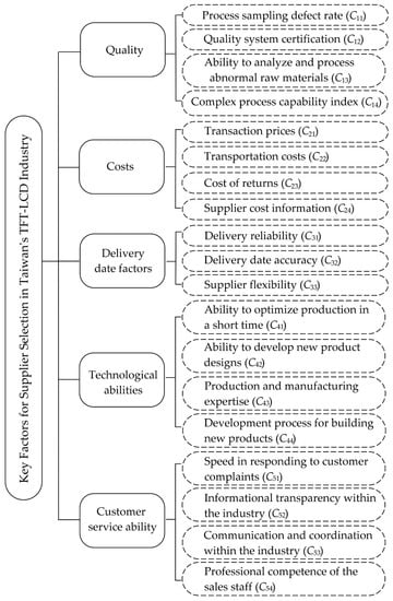 As a result of the pressure from rapid changes in globalization over the past 20 years and the arrival of the information technology era, information interactions and flow between upstream and downstream agents in the supply chain have evolved. Suppliers must consider how to coordinate with midstream panel vendors to respond to emergencies and adapt to market needs and changes [30]. Mohammed et al. [5] found that suppliers were typically selected using the TC such as cost and quality, whereas the RC such as agility and flexibility were ignored. In addition, Chan and Chan [31] pointed out that due to the pressure of rapid changes in globalization, outsourcing activities have become increasingly prevalent. Therefore, the supplier selection has become more and more important and is part of the active efforts of various companies to incorporate business strategies. They summarized six major dimensions, including cost, logistics, flexibility, innovation, quality, and service capability and listed 20 evaluation criteria.