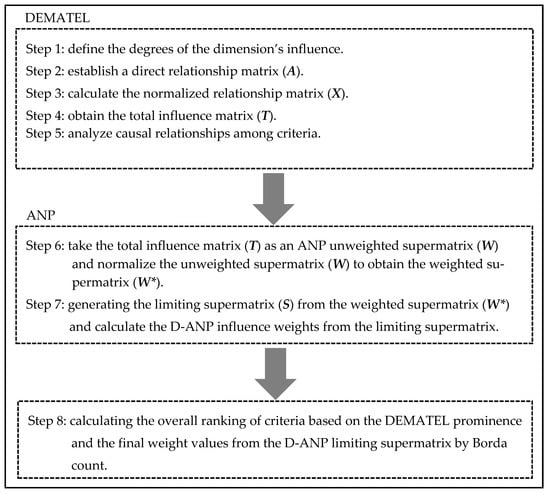 The D-ANP is a hybrid MCDM that combines the DEMATEL and the ANP [73] methods. Although using the conventional average method (equal cluster-weighted) to obtain the weighted supermatrix in the ANP procedure is simple, it is likely to ignore the different degrees of influence among the dimensions [6]. Therefore, the D-ANP method was proposed to solve this problem. Furthermore, the super matrix that must be calculated in the ANP procedure can be transposed and normalized in the DEMATEL-derived total influence matrix (T); then, the weighted matrix is obtained and multiplied by itself until its value reaches a convergent fixed value. Thus, the weighted value of each dimension is obtained.