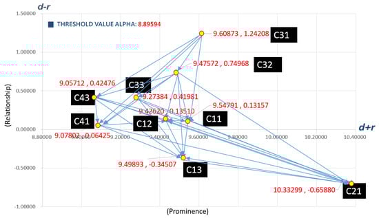 Step 5: Analyze causal relationships among criteria: From the total influence matrix, the sum of each row plus the sum of each column (i.e., d + r) is called prominence, which shows the relational intensity of the element. The greater the prominence becomes, the higher the degree of influential relationship is among the factors. The sum of each row minus the sum of every column (i.e., d − r) is called relation. If the relation is positive, then the element is referred to as a cause that actively affects other elements. If the relation is negative, then the element is referred to as an effect that is affected by other elements. Subsequently, the relationship of causes and effects can be depicted in a casual diagram with the prominence (d + r) in the horizontal axis and the relation (d − r) in the vertical axis. The casual diagram can reflect the complex causal relationship among the dimensions and criteria.