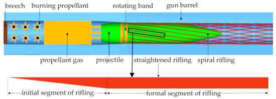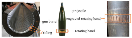 On the structural design of a gun, usually, there are one or two rotating bands encircling the projectile and dozens of spiral riflings attaching at the bore surface, as exhibited in Figure 2. For most types of rotating bands, their materials are copper alloy because the strength of the copper alloy is lower than that of steel, which is adopted by the gun barrel and riflings.
