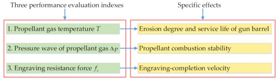 The high-temperature of the propellant gas causes the erosion phenomenon on the internal surface of the gun barrel, and the erosion degree affects the service life of the gun barrel. Hence the temperature value of the propellant gas T is the first performance evaluation index during the engraving process. In this paper, there are totally three performance evaluation indexes, and they are described in Figure 8.