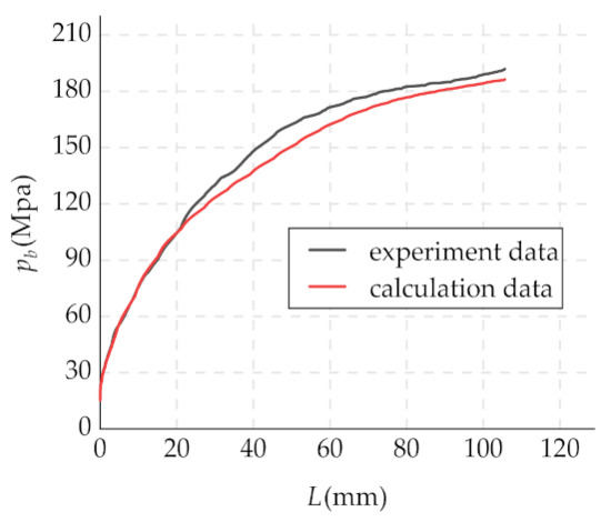 The displacement–pressure data at the projectile base, which are extracted from Figure 9a, are shown in Figure 10. As can be seen, the calculation data match well with the experimental data from Figure 6a. Hence, the accuracy of the launch-load model is validated.