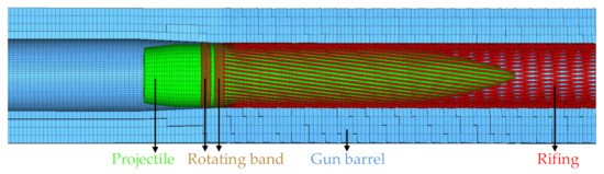 The finite element model of the mechanical part of the gun engraving system is built by Hypermesh software, as shown in Figure 11. Here, the cross-section of the rotating bands is enlarged for better display, as shown in Figure 12. Specifically, this model contains four components, namely the gun barrel, the rifling, the projectile and the rotating band. In the model, there are 48 riflings and 2 rotating bands in total. In addition, the whole finite element model has 1,443,203 elements and 1,285,561 nodes, and all element types are hexahedron for computational accuracy. Peculiarly, considering the large deformation of the rotating bands, the element sides of the rotating bands range from 0.3 mm to 0.5 mm, while the element sides of other components are from 3 mm to 6 mm. The propellant gas pressure, which is calculated by the launch-load model in Section 2.3.1, is applied on the projectile base by Vuamp subroutine in Abaqus software. The Vuamp function offers a data exchange interface between the launch-load model and the finite element model. Hence, the integrated gun engraving system model is a two-way fluid–solid coupling model, and there is an interaction between the launch-load model and the finite element model. Finally, the dynamic response data of the rotating band and projectile are calculated by Abaqus explicit solver.