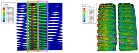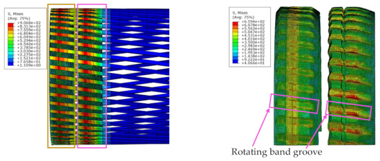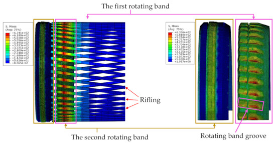 In the first period, the initial segments of 48 riflings are cutting the first rotating band. Thus, the high stress produces plastic and damage deformation of the first rotating band, so the corresponding 48 rotating band grooves form, and the rotating bands begin to rotate. As for the second rotating band, it is squeezed by the bore surface and also undergoes plastic deformation, as shown in the brown wireframe in Figure 13. Hence, the second rotating band can avoid the spillage of the propellant gas.