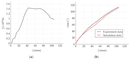 The launch experiment is described below. A hole was dug throughout the gun barrel, and the pressure sensor was fixed in this hole to measure the propellant gas pressure at the projectile base. The measured data were saved in a data processing computer, as shown in Figure 6a. Furthermore, the projectile velocity was also obtained. More specifically, we connected the projectile rigidly with a calibrated bar, which can move with the projectile. A high-speed camera was used to collect the movement data of the calibrated bar. Moreover, the velocity of the calibrated bar is equal to that of the projectile. Finally, the projectile velocity is shown in Figure 6b.