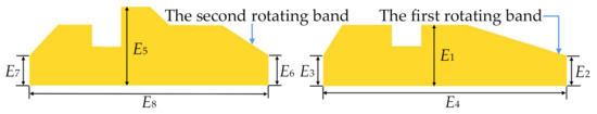 The engraving process can be described as follows: First, the projectile is pushed by the propellant gas. Subsequently, the contact occurs between the rotating band, riflings and bore surface. Thus, the projectile starts to translate and rotate. When the rotating band moves across the initial segment of riflings, the engraving process finishes, and at this time point, the velocity of the projectile is called engraving-completion velocity. After the engraving process, the rotating band is engraved, as exhibited in Figure 2.