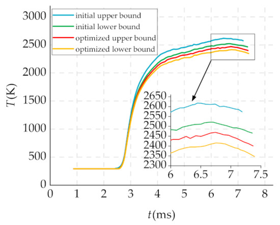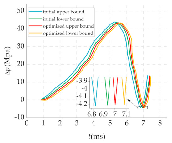 Finally, by substituting the optimized size parameters data into the model of the gun engraving system, the initial and optimized interval of performance evaluation indexes are obtained, as shown in Figure 22,Figure 23,Figure 24. Additionally, the detailed performance evaluation indexes of point A are listed in Table 7. As can be seen, after optimization, decreases, and the percent decrease of ranges from 6.34% to 18.24%. T also decreases, and the percent decrease of ranges from 1.91% to 7.45%. At the same time, the change of is not obvious and the percent increase of ranges slightly from 0.12% to 0.36%. The optimization results mean that, first, the engraving-completion velocity of the projectile raises. Then the erosion degree of the gun barrel declines during the engraving process, and the service life of the gun barrel improves. Finally, the combustion stability of the propellant has no obvious change.