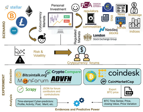 Figure 1 provides a general overview of the scenario, its challenges, and the main objectives in this research work. A regulated/controlled market is one in which the government or another public authority exercises some degree of oversight and facilitates multiple third-party buying and selling interests in financial instruments. Commodities, bonds, and stocks are traditional considered regulated markets in accordance with their non-discretionary rules. On the contrary, cryptocurrencies function without institutional backing and they are intrinsically borderless and, as a consequence, in a high volatile scenario which may impede their usage for payments or settlement. Accordingly, investors, particularly personal investors, may not be prepared to rapid boom/bust cycles. Unlike regulated markets, crypto-asset trading platforms do not have measures to mitigate price swings. Higher risk can be alleviated by different data sources to allow a personal investor to take an informed decision. In this respect, cryptocurrency investors simply rely on online forums and the own cryptocurrency price analysis as information sources.