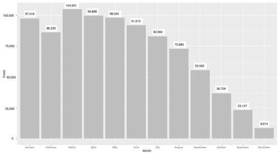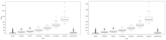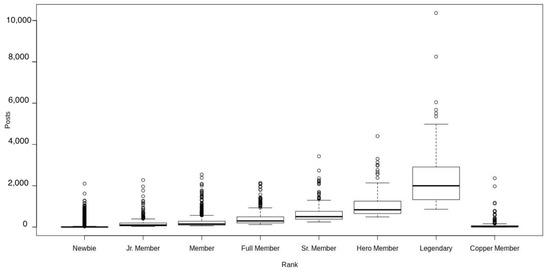 The histogram presented in Figure 5 shows the distribution of posts according to the month they were posted. It shows the tendency of the forum clearly. The users of the sample started 2018 posting 97,416, but this value decreased slightly the next month. It reached the maximum in March, and then it started to decrease progressively. From that month on, the decreases became more significant until December, when only 8614 posts were published. This fact reflects the loss of user participation in the forum. Because this histogram is strongly affected by the behavior of newbie users, the distribution of posts according to ranks was also checked and represented in the box-plot in Figure 6.