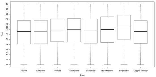 The diagram confirms that there is no big difference between schedules, as the boxes in all cases stay approximately in the previously calculated range. The rank that differs the most is Legendary: the box is located between 10:05 and 19:36 and the median is situated at 14:57. This box plot confirms that no pattern of activity depends on the rank and, therefore, all of the users post in the same time slot.