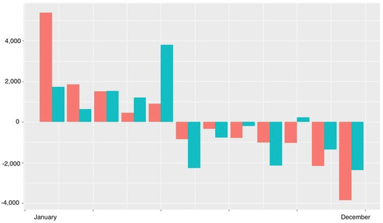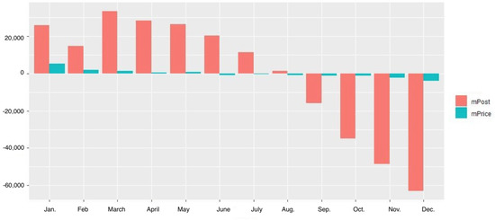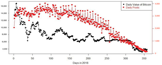 In order to assess the credibility and reliability of the forum, the evolution of its activity is visualized along with the Pearson correlation for daily increments and a proper interpretation. The time scale for the analysis of the data set is set to one day as well as one month. For a monthly analysis, Figure 7 shows the nominal comparison between monthly posts and closing price of BTC in USD ($) during 2018. Additionally, Figure 8 shows the connection between the variation in posts per month and the monthly value of BTC in 2018.