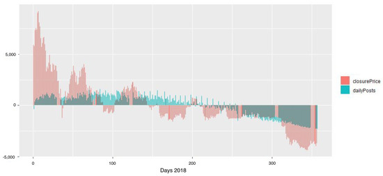 Figure 10. Comparison between the variation of posts per day and the daily closing value in 2018.