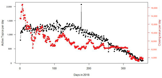Figure 12 shows the relationship between the active topics per day and the daily closing value during 2018. The information that can be extracted from this graphic is especially relevant with regard to the activity in the forum when the values are so extreme. In other words, the forum shows less activity in days when BTC has a rising value, as well as the days immediately afterwards than a day where the value falls. In that case, the activity in the forum increases. This behavior can be also seen in forums from other areas, like sports or video games. If there is an important announcement, the forum has more views in a close group of topics that are directly related to that announcement. However, when there is no event or relevant situation, there are more active topics. Moreover, the forum keeps the topics active while they are relevant. In other words, there will be always a correlation between the activity in a forum and the reason for the creation of the forum.