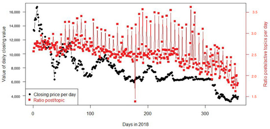 Figure 13. Comparison between the post/topic ratio and the daily closing value in 2018.