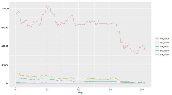 Figure 17. Value in USD of Bitcoin (btc_value), Bitcoin Cash (bta_value), Ethereum (eth_value), Litecoin (ltc_value), and Stella (ste_value) in 2018.