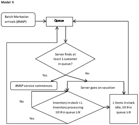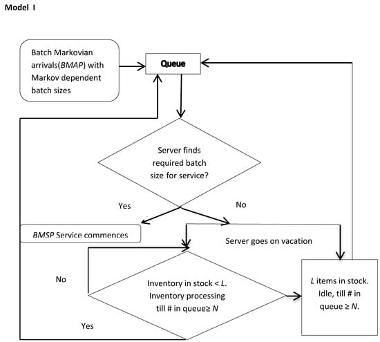 This work could also be considered an extension of the queuing-inventory problem considered in Divya et al. [9]. In [9], the authors considered a single server queuing-inventory system in which customer arrival is governed by a Markovian arrival process (). The service process with as well as without inventory in stock follows two distinct phase-type distributions (one in which the processed item is available and the other in which the processed item is not available at a service commencement epoch). This assumption of the service process is made based on the observation that, with the availability of additional items at the service commencement epoch, the service time of customers becomes shorter as the item does not need to be processed before initiation of the service. The server goes on vacation when the system is empty and produces inventory for future use. The server returns from vacation once the number of customers in the system reaches a certain prescribed limit N. It is assumed that customers join the queue with probability p and, after spending a random time period in the queue (which is exponentially distributed), become impatient and renege. The impacts of customer behavior on individual optimal strategies, revenue to the server, and social optimal strategy are analyzed extensively in that paper using numerical experiments. Earlier works, with some connection to the present work, in terms of processing of items to be delivered to the customers, are Kazirmsky [10] (service time depends on the number of items processed and customer arrivals following ), Hanukov et al. [11], and Divya et al. [12], in addition to Divya et al. [9]. There are other works in which the service requires an additional item (see [13,14,15]). In the models analyzed by Baek et al. [13] and Dhanya et al. [15], additional items required for services arrive according to the Markovian arrival process (). All of the works mentioned above are related to queuing systems with single arrival and/or single service at a time. The literature on vacation queuing systems is also quite extensive. (The concept was introduced by Levy and Yechiali [16] and reviews of the literature can be found in [17,18,19]).