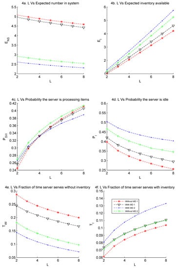 Effect of L on performance measures: For both models, the increase in L increases not only the availability of inventory (Figure 4b) but also the time spent in inventory processing (Figure 4c). The expected queue length decreases as the service rate is higher with inventory (Figure 4a) and the server goes on vacation more often, as expected. As L increases, the fraction of time that the server serves customers with inventory increases (Figure 4e,f) and the idle time is reduced (Figure 4d).