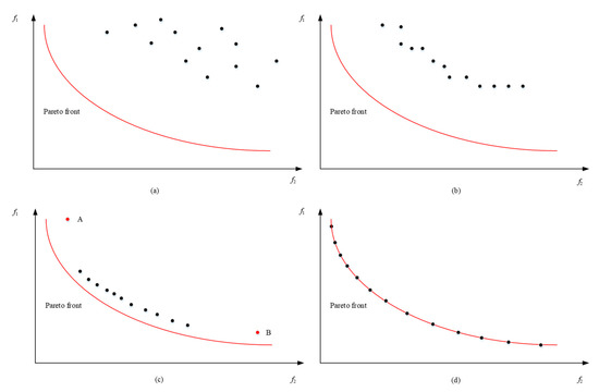 After the above operation, the distribution of individuals in the population in the objective space will gradually move towards PF, as shown in Figure 1b. However, the convergence level of the whole population is not enough at this time, so high selection pressure is still needed to promote convergence. As the iteration goes on, the distribution of individuals in population in the objective space will gradually become close to PF, as shown in Figure 1c. As introduced in Section 1, the indicator-based algorithm converges quickly but loses diversity easily. The example in Figure 1c shows that these individuals are close to PF under the guidance of the indicator, but the convergence position is more inclined to the central region of PF. At this point, more computing resources need to be tilted to increase the diversity of the population, such as the preference to keep the individual A and the individual B in Figure 1c into the next generation. By changing the computational resource allocation according to the evolutionary state of the population, individuals in the population can maintain good convergence and diversity. As in Figure 1d, the individuals in the resulting solution set are uniformly distributed on PF.