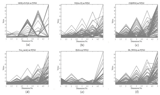 (1) General MaOPs: As mentioned in Equation (1), general MaOPs are problems with M conflicting objectives. The overall goal of solving MaOPs is to obtain a solution set that can characterize PF, but at the same time there are a variety of problems. For objective numbers, MaOPs are more difficult to resolve than MOPs. Low dimensional optimization is mainly solved by non-dominated sorting, such as NSGA-II [4] and improving the strength of the Pareto evolutionary algorithm (SPEA2) [78]. The non-dominated sorting is described as follows: for the minimization problem, taking two vectors x1 and x2 in Ω, if and only if fi(x1) ≤ fi(x2) for each i in {1, 2, …, M} and fj(x1) < fj(x2) for at least one j in {1, 2, …, M}. Let us call it F(x1) Pareto dominates F(x2), and the notation is F(x1) > F(x2), and if, and only if, no point x in Ω to satisfy F(x) > F(x*), called F(x*) Pareto optimal solution and x* is Pareto optimal point, and the set of all Pareto optimal solutions is PF mentioned above, the set of all Pareto optimal points is called Pareto Set (PS).