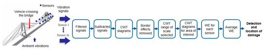 It should be noted that, once the characterization of the bridge to be studied is done and the effect of all the possible dangerous damages are known with this method, the steps, including the selection of the most convenient filter, range of scale, and mother wavelet, would be eliminated and the diagnosis would be faster. The schematic diagram of the proposed methodology is presented in Figure 1.