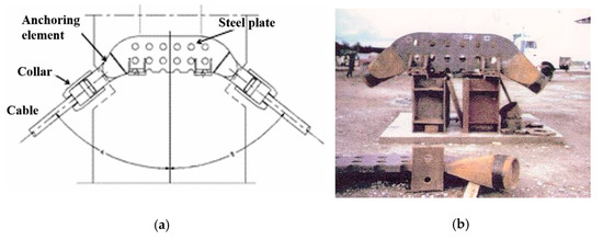 The upper anchoring system design [30] consists of one steel plate welded to the anchoring elements, which are cylindrical on one side and flat on the welded side (Figure 4). The cylindrical side is threaded to screw the collar that holds the cable in the upper side.