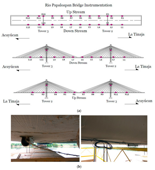The sensors were distributed to analyze the dynamics of the bridge deck and of the four towers; thus, the strain gages (which were used for the purpose of this article) are located 10 under each one of the main girders of the bridge deck, and one on the side at the half height of each tower (L1-L12 and R1-R12 in Figure 6a). On top of each one of the four towers, 2 tilt meters and 2 accelerometers are located. The other 16 accelerometers were placed on the middle of cables 4 and 11 of each semi-harp. The measurements obtained with those tilt meters and accelerometers were not used for the purpose of this article; however, their positions can be figured out by analyzing Figure 3 and Figure 6a. Additionally, in Figure 6b two pictures of sensor R2 installed on the bridge are included.