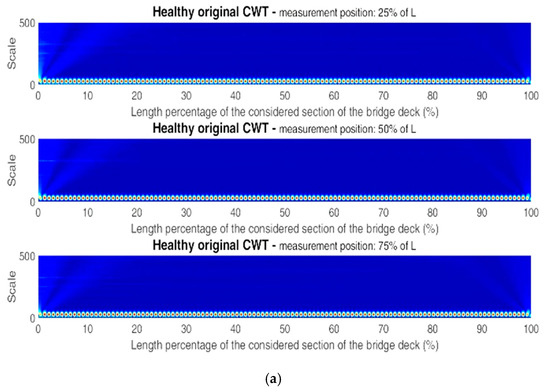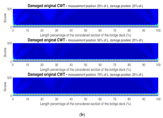 In Figure 8, the CWT diagrams for a healthy bridge deck and a damaged bridge deck at 25% of L obtained from the corresponding acceleration signals at the three locations are shown. As it can be observed in this figure, for this initial wide range of scale (from 1 to 500) there is a tiny clue of damage around 0.25 L, but it is not very evident because it is partially masked. In this range of scale, the WE is amplified mainly in the zone of the influence of the first natural frequency and secondly in the regions of the border effects (around 0% and 100% of L) and damage (around 25% of L), hindering a clear damage identification. Thus, comparing the damaged diagrams (Figure 8b) with the corresponding ones of the healthy case (Figure 8a) could seem very similar each other; however, the presence of damage is there but masked.