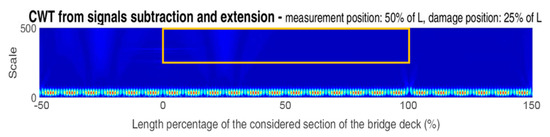 In order to increase the evidence of damage, the signals used for obtaining the diagrams shown in Figure 8 were subtracted (damaged ones—healthy ones) and then the resultant signals were extended by using the MATLAB© command “wextend” (antisymmetric-padding) for eliminating the border effects. In Figure 9, the subtracted and extended CWT diagram is shown just for one measurement in the interest of brevity. It can be observed that the border effects were taken out of the real bridge length considered; whereas the useful subtraction effect cannot be clearly distinguished yet because the scale range is not the convenient. Therefore, just the zone inside the yellow square must be considered, in this way the real bridge length is again analyzed (but now without border effects), whereas the scale from 250 to 500 allows to focus on the damage effect and the influence of the subtraction will be appreciated. Likewise, once the step related with the subtraction of signals was applied, the cases presented in every figure as “damaged bridge” correspond with the use of the subtracted signals.