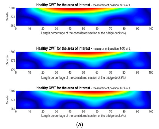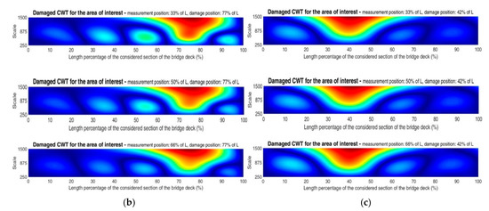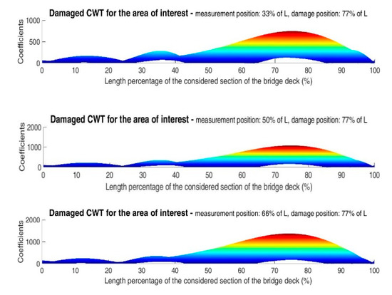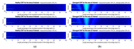 Thus, the CWT diagrams for the three measurement positions considering the region of the yellow square are shown in Figure 10b and the respective ones for the healthy bridge are shown in Figure 10a. Comparing those figures, the presence of damage is clear with evident indicators of high wavelets’ coefficients (energy) around the damage location. It should be noted that damage identification is possible even if the measurements come far away from the damage position; however, the closer the measurement is to the position of the damage, the greater the energy, as it will be shown next.