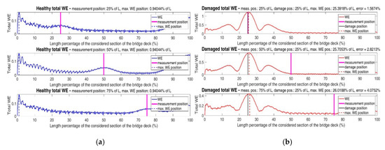 The WE energy for a healthy and a damaged bridge deck was calculated for each point of the considered length by means of the area under the curve along the adjusted range of scale. The results for healthy and damaged cases are shown in Figure 11, where it can be observed that the WE for the healthy cases is very low and flat with tiny WE accumulation at the measurement points and at the ends because of the remaining border effects. Whereas, for the damaged cases, no matter the measurement point, the WE accumulation is always around the damage location and its magnitude is much higher compared with the healthy cases. Even for the case of measurement at 0.75 L, the percentage of error for the damage localization is very acceptable (4.1%), while for the other two measurements it is smaller due to the closeness with damage (2.8% and 1.6% for measurement at 0.50 L and 0.25 L, respectively). The advantage of this method of detecting damage using just one point of measurement far away from damage is interesting.