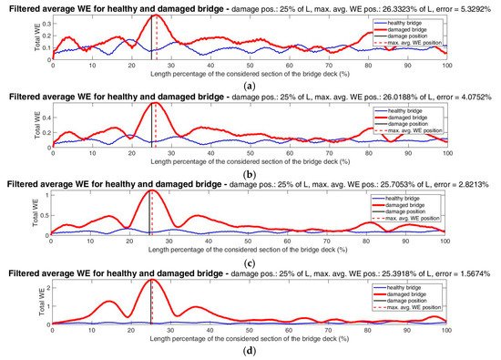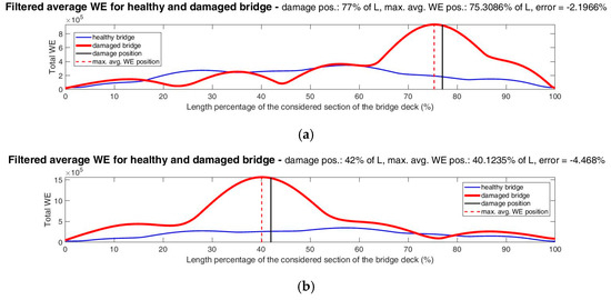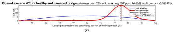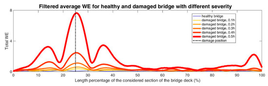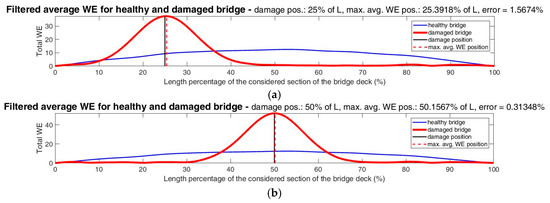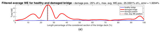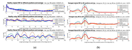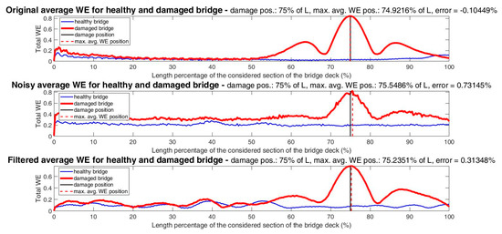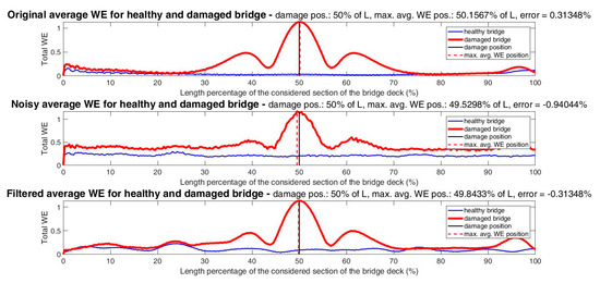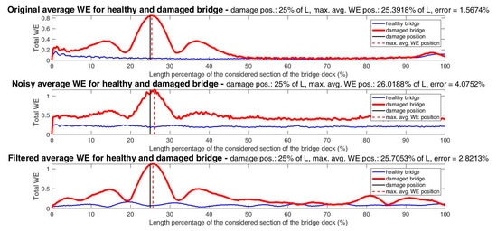 Lastly, for an easy visualization, in Figure 13 just the average WE is shown for a healthy and a damaged bridge deck and for the three scenarios of signals (original, noisy and filtered), with the respective percentage of error. It is important to notice that if the considered vehicle speed is set to 2, 3, 4 and 5 m/s, the percentage of error for the damage location considering the original signals changes to 1.85%, 2.15%, 2.49% and 2.91%, respectively. Whereas, for the speed of 1 m/s, the corresponding percentage of error is 1.57%, as it can be observed in Figure 13.