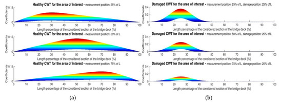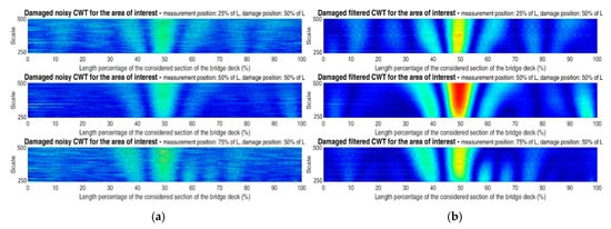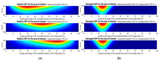 CWT diagrams from acceleration signals for the area of interest: (a) Healthy bridge deck and (b) damaged bridge deck at 0.25 L. Three different measurement positions for each one (from top to bottom: 0.25 L, 0.50 L, and 0.75 L).