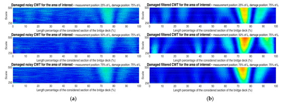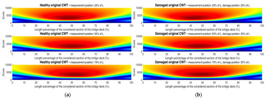 CWT diagrams from original acceleration signals: (a) Healthy bridge deck and (b) damaged bridge deck at 0.25 L. Three different measurement positions for each one (from top to bottom: 0.25 L, 0.50 L, and 0.75 L).