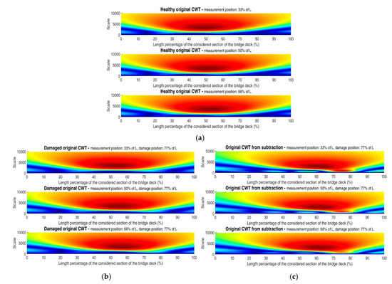 CWT diagrams from original displacement signals: (a) Healthy bridge; (b) bridge with damaged cable at 0.77 L before the signals subtraction; and (c) bridge with damaged cable at 0.77 L after the signals subtraction. Three different measurement positions for each one (from top to bottom: 0.33 L, 0.50 L, and 0.66 L).