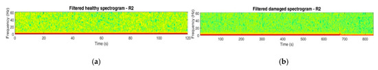 Spectrograms from filtered experimental signals: (a) Healthy bridge and (b) damaged cable T1S5.