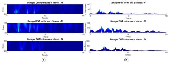 CWT diagrams from filtered experimental signals of damaged cable T1S5 for the area of interest: (a) Showing the scale in vertical axis and (b) showing the coefficients in vertical axis. Three different measurement positions for each one (from top to bottom: R1, R2, and R4).
