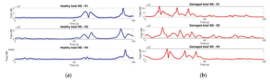 Total WE from filtered experimental signals: (a) Healthy bridge and (b) damaged cable T1S5. Three different measurement positions for each one (from top to bottom: R1, R2 and R4).