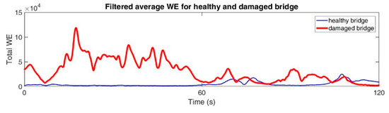 Finally, the total WE’s obtained from the CWT diagrams of Figure 29 and Figure 30 are shown in Figure 32. In Figure 33, the corresponding total average WE for the healthy and damaged cases are exposed into the same plot. The WE’s for single measurements are clearly higher for damaged cases (Figure 32) and the maximum total average WE is almost five times higher for the damaged case with respect to the healthy case (Figure 33). This exercise was additionally made for four different periods of 120 s of the healthy bridge and the damaged cable, and in all the cases the average WE was higher for the damaged bridge and the magnitudes of the maximum average WE’s were similar to the ones shown in Figure 33. Then, regardless of the randomness of the traffic, significantly higher WE was observed for the damaged bridge and the detection and localization of the damage was possible. Nevertheless, in future works a controlled test will be performed during the maintenance programs, which involves the removal of cables for changing damaged upper anchoring systems, and, in this way, each step of the proposed method will be carried out for a precise validation.