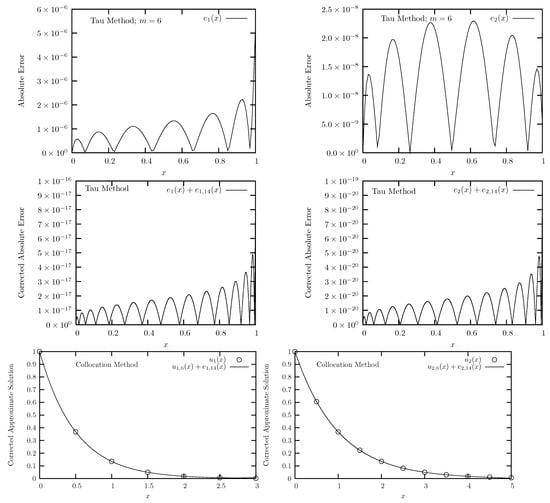 Let us constitute residual correction procedure for Bernstein collocation method. We omit the residual correction procedure for GBF collocation method. By using the same method described in Section 4.1.1, we can get the coefficients of . To do this, we construct m sets of linear or nonlinear equations such that