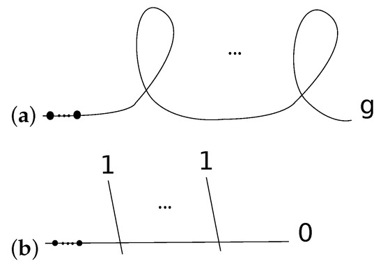Consider an n-pointed genus curve with g irreducible nodes, as in Figure 1a. This curve represents the generic point of a stratum deep in the stratification of the boundary of . A repeated application of factorization (the clutching type described in Equation (3)) yields the following, for any :