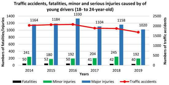 We mainly dealt with research on the behavior and reactions of young drivers when driving a car. Before this significant research, it was appropriate to process as much traffic accident data focused on young drivers in the Slovak Republic as possible. This section, therefore, provides basic statistics on the number of road accidents and related fatalities, as well as major and minor injuries caused by young drivers and drivers with a lack of driving experience. Figure 1 is a graphical representation of traffic accidents and their consequences caused by young drivers aged between 18 and 24. Although the numbers have a decreasing tendency, there are still efforts by police to reduce the number of traffic accidents as well as their consequences.
